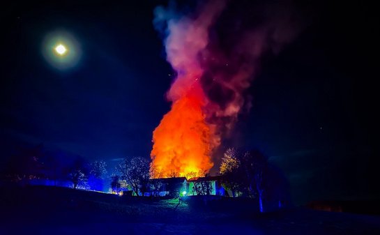 Auf einem landwirtschaftlichen Anwesen stand der Wirtschaftstrakt in Vollbrand. Da sich das Anwesen auf einem kleinen Hügel befindet, gestalteten sich ganz besonders die Anfahrt und Aufstellung der Einsatzkräfte als auch die Wasserversorgung als sehr schwierig.